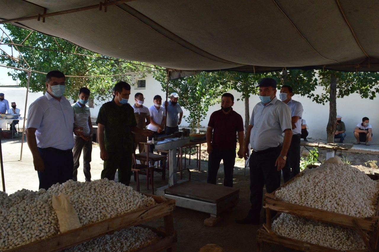 Бугун туман ҳокими Муроджон Ачилов бошчилигида сектор ва мутсадди ташкилот раҳбарлари “оқ олтин” хирмонида бўлиб, пилла топшириш жараёнида иштирок этдилар. Илғор пиллакорларимиз бир қути ипак қуртидан 62.5 килограм “кумуш тола” етиштириб, шартнома режаларини ошиғи билан бажармоқдалар. Қилган самарали меҳнатларининг маҳсулини биринчилардан бўлиб топширган пиллакорларга туман ҳокимлигининг эсдалик совғалари топширилди.