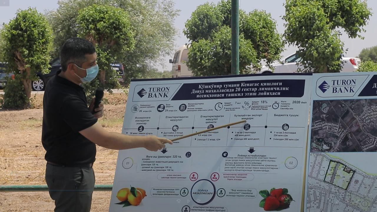 Ушбу соҳани ривожлантиришга “Турон банк” лойиҳа координатори этиб белгиланди. Банк томонидан Қўшкўпир тумани “Довуд” маҳалла фуқаролар йиғини ҳудудида 21,8 гектар ер майдонида 26 млрд.сўмлик йирик лойиҳа амалга оширилиб, лимончилик иссиқхонаси қуриш режалаштирилган.