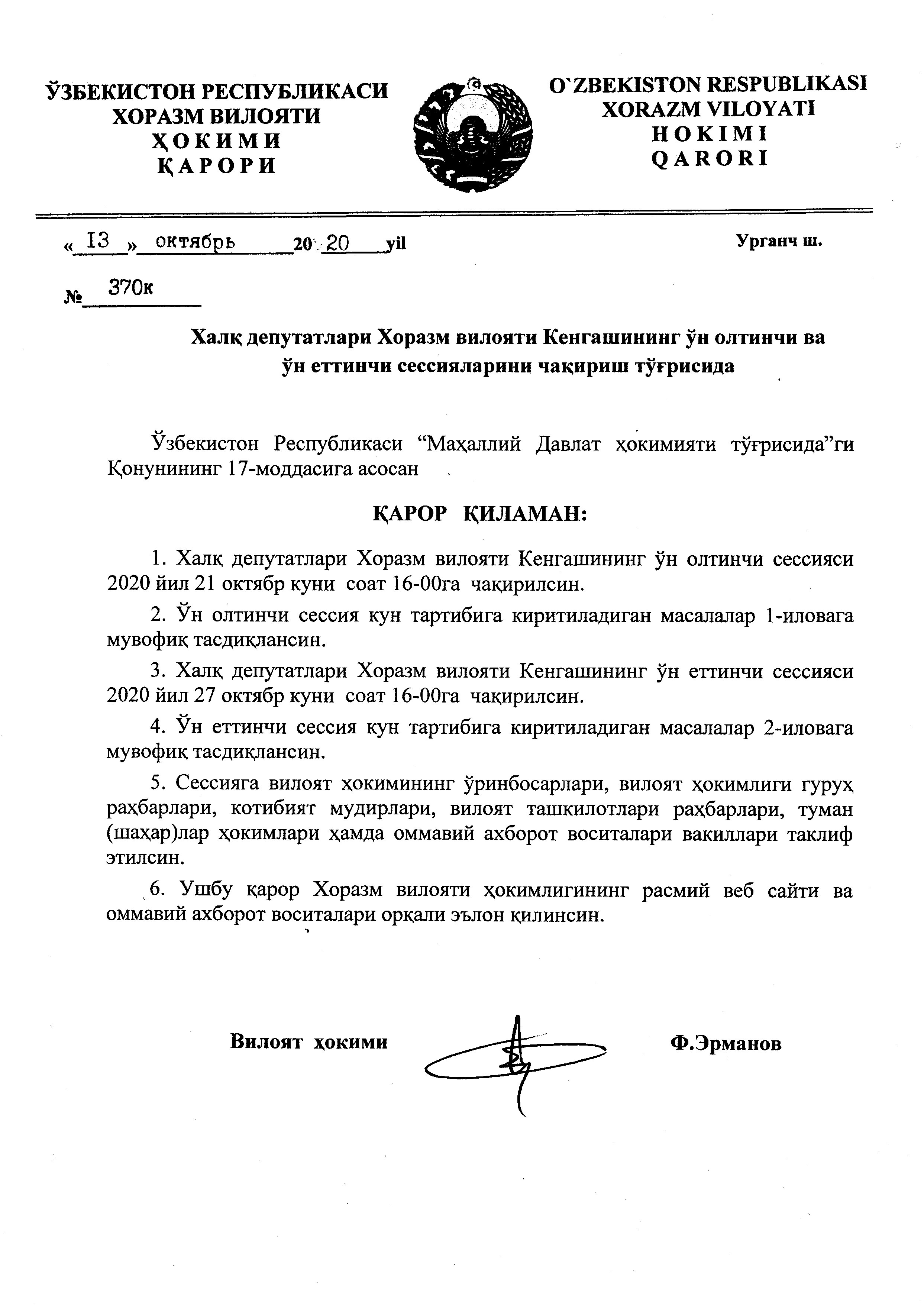 - Халқ депутатлари Хоразм вилояти Кенгашининг ўн олтинчи сессияси 2020 йил 21 октябр куни соат 16.00га чақирилсин.
