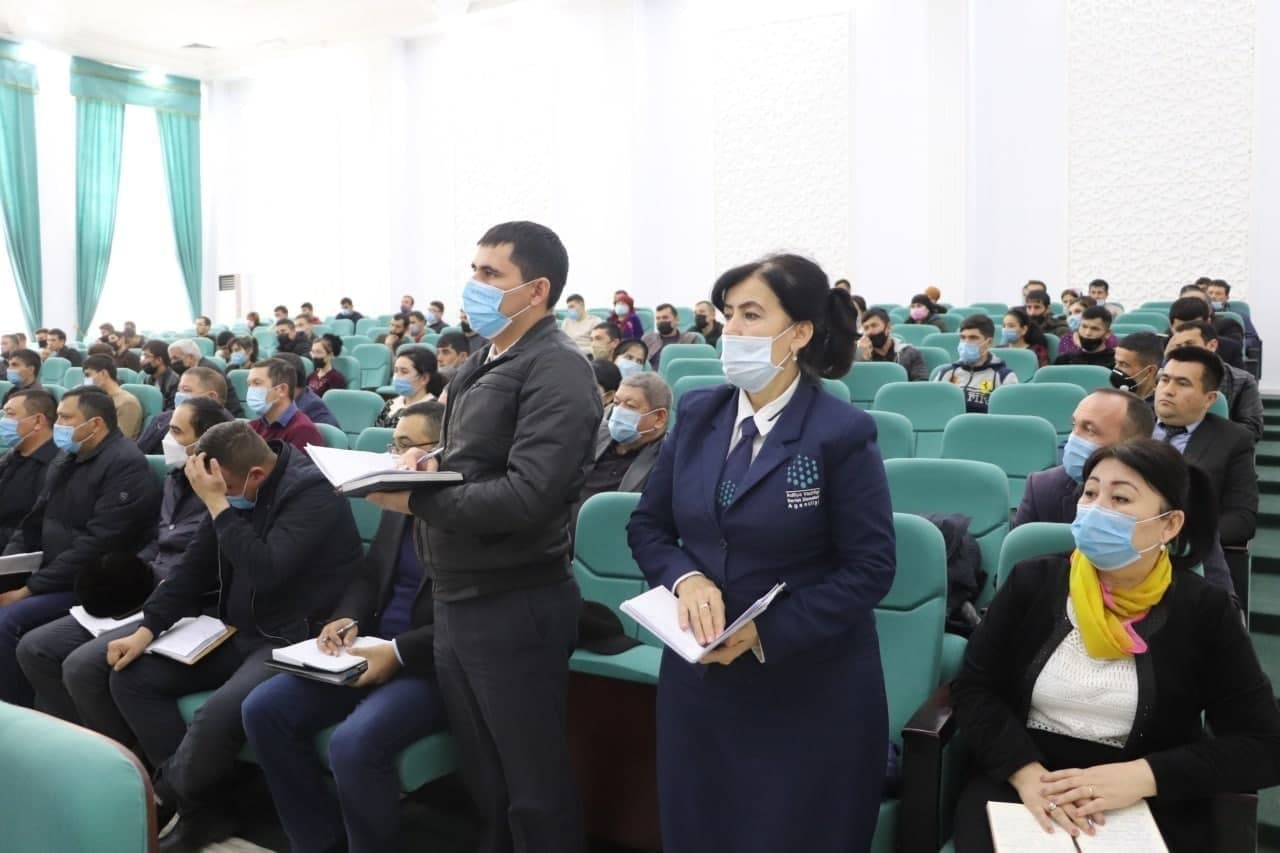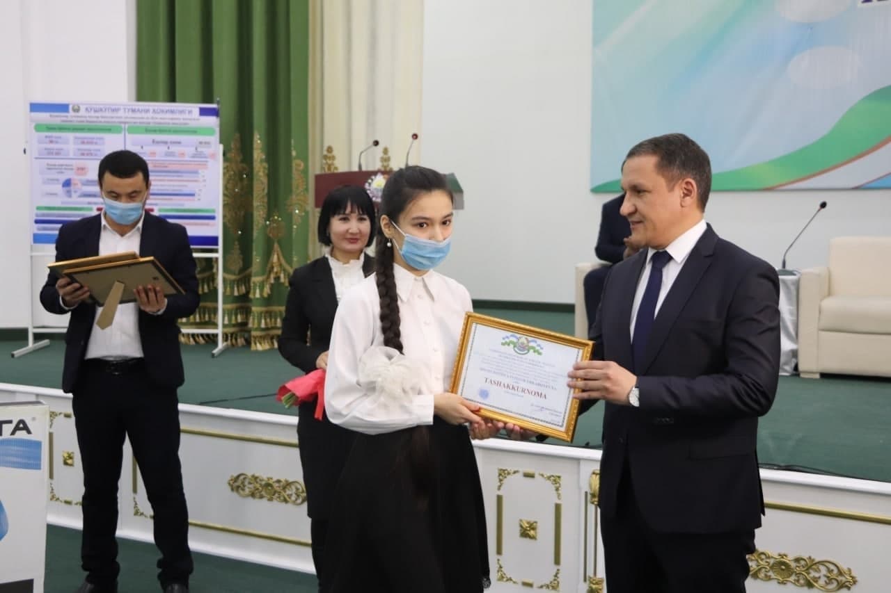 Шундан сўнг, туман ҳокими 2020-2021 ўқув йилида ўтказилган фан олимпиадасининг вилоят босқичида юқори ўринни эгаллаб, республика босқичига йўлланма олган ўқувчиларни тақдирлади. Очиқ мулоқот доирасида ёшлар савол, таклиф ҳамда муаммолари билан қатнашдилар.