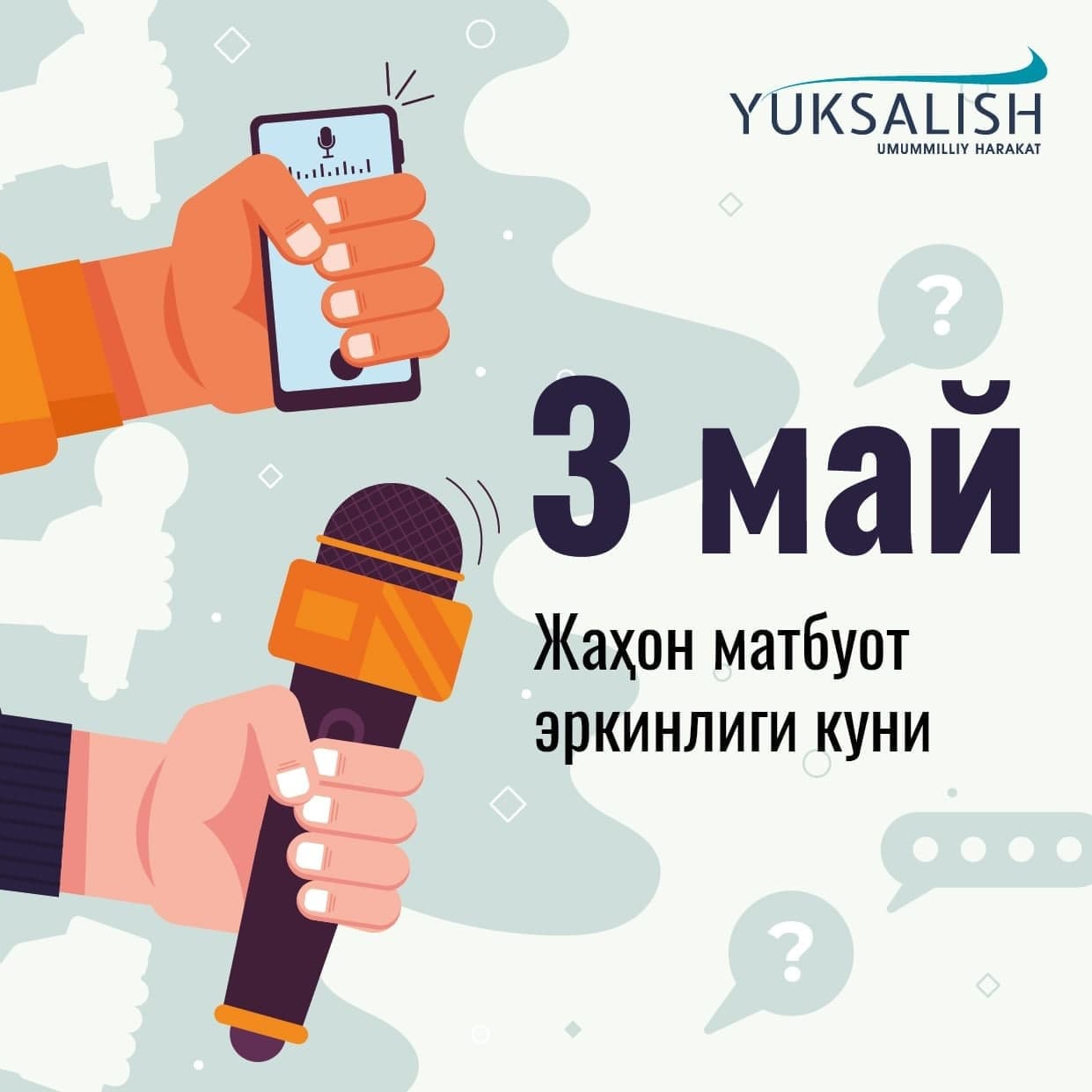 Азиз журналист ва блогерлар! “Юксалиш” умуммиллий ҳаракати меҳнатингизни қадрлайди ва ҳурмат қилади. Сизлар — бизнинг асосий ҳамкоримизсизлар. Танлаган касбингизда профессионаллигингиз, журналистика принципларига содиқлигингиз учун миннатдорлик билдирамиз!