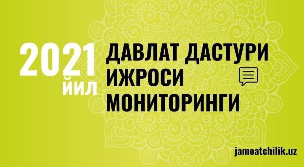 Эслатма: Давлат дастурининг ижросини жамоатчилик иштирокида мониторинг қилиш мақсадида jamoatchilik.uz (http://jamoatchilik.uz/monitoring) платформаси ишга туширилган.