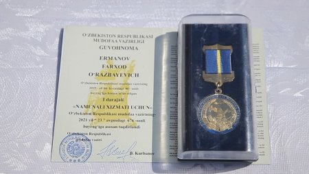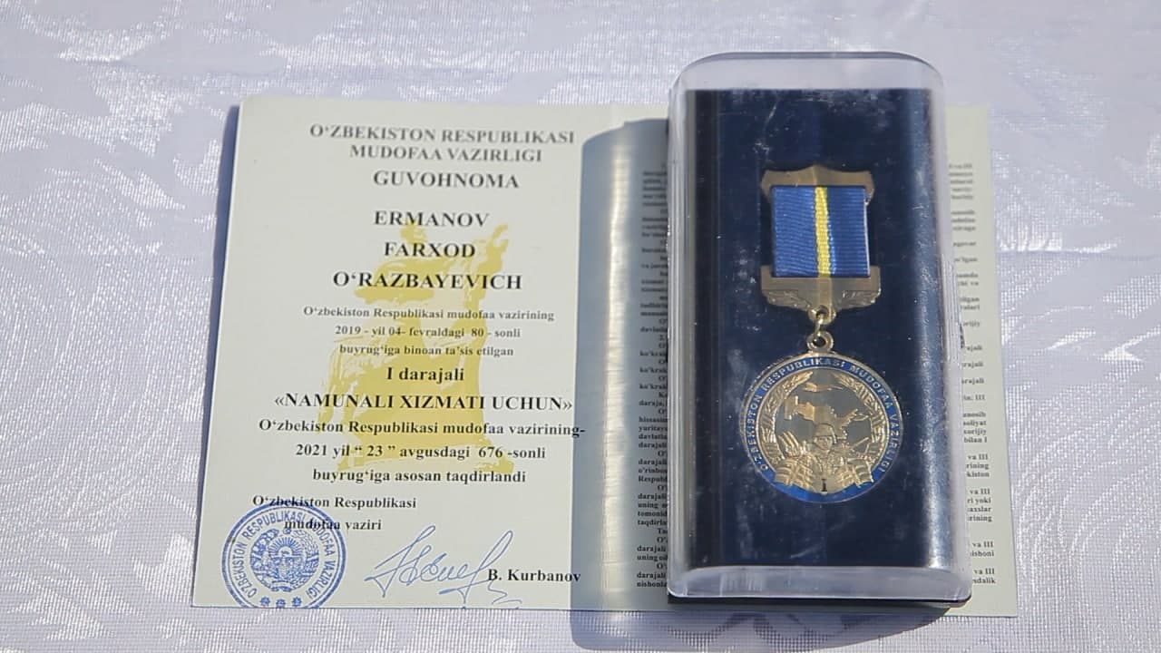 Ўзбекистон Республикаси Мудофаа вазирининг ўринбосари, полковник Қ. Турсунов Мудофаа вазирининг Хоразм вилояти ҳокими, ҳарбий-маъмурий сектор раҳбари Фарход Эрмановни 1-даражали “Намунали хизмати учун” кўкрак нишони билан тақдирлаш тўғрисидаги буйруғини ўқиб эшиттирди ва мукофотни ўз эгасига тантанали равишда топширди.