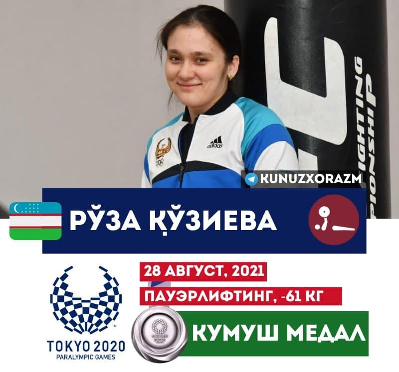 Токио-2020 паралимпиадасининг пауэрлифтинг (ётган ҳолда тош кўтариш) мусобақасида Ўзбекистон шарафини ҳимоя қилаётган шовотлик спортчи  Рўза Қўзиева 130 кг вазнли тошни кўтариб, кумуш медални қўлга киритди.