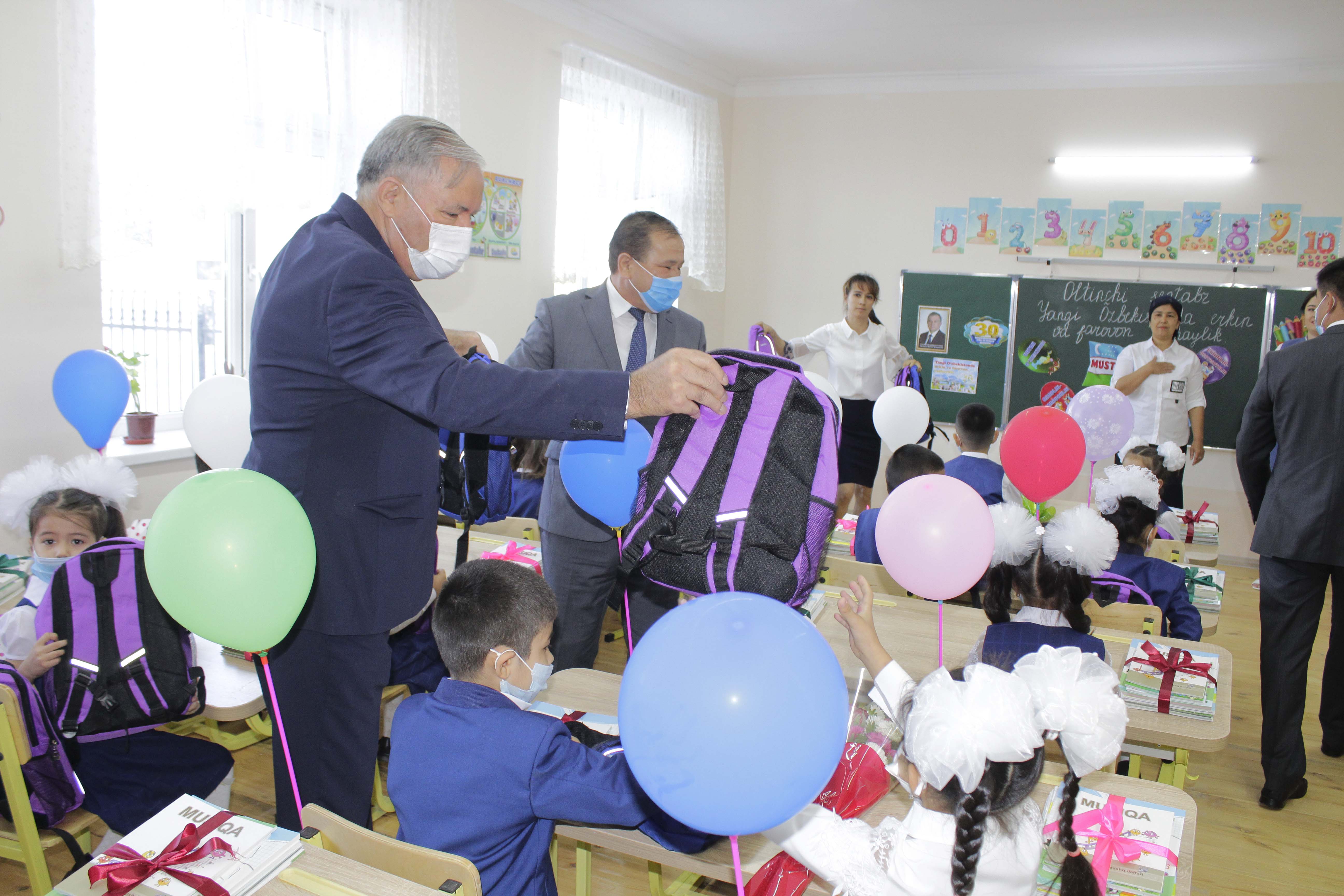 Вилоят ҳокими мактаб жамоасини янги ўқув биноси, ўқув йилининг бошланиши билан қутлаб, келгуси ўқиш ва ишларида омад тилади. 1-синф ўқувчиларига чиройли портфель ва ўқув қуроллари тўпламидан иборат "Президент совғаси" топширилди.