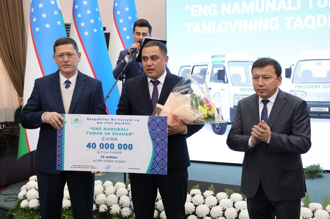 Бугун Республика Маънавият ва маърифат марказида маънавий-маърифий соҳадаги “Энг намунали туман ва шаҳар” ҳамда “Энг намунали вазирлик ва идора” танлови ғолибларини тантанали тақдирлаш маросими бўлиб ўтди. “Энг намунали туман ва шаҳар” йўналишида Янгибозор тумани фахрли 2-ўринни эгаллаб, пул мукофоти ва китоблар тўплами билан тақдирланди.