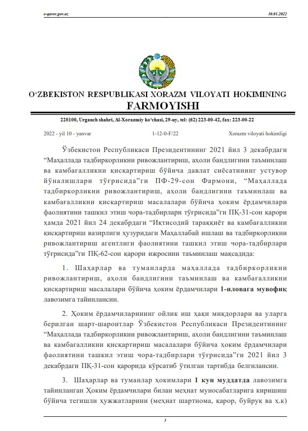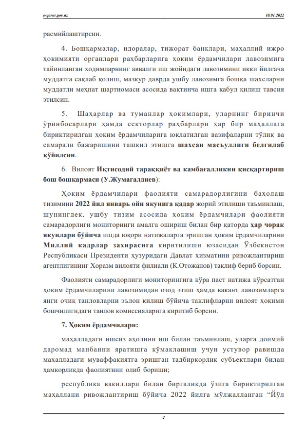 Хоразм вилояти ҳокимлигининг 2022 йил 10 январдаги 1-12-0-F/22 –сонли фармойиши билан вилоятдаги 526 та маҳаллада фаолият олиб борадиган ҳоким ёрдамчилари лавозимга тайинланди. Ушбу ҳоким ёрдамчилари маҳаллаларда тадбиркорликни ривожлантириш, аҳоли бандлигини таъминлаш ва камбағалликни қисқартириш масалалари билан шуғулланади. Ҳоким ёрдамчиларининг ойлик иш ҳақи миқдорлари ва уларга яратилган шарт-шароитлар Ўзбекистон Республикаси Президентининг 2021 йил 3 декабрдаги “ Маҳаллада тадбиркорликни ривожлантириш, аҳоли бандлигини таъминлаш ва камбағалликни қисқартириш масалалари бўйича ҳоким ёрдамчилари фаолиятини ташкил этиш чора-тадбирлари тўғрисида”ги қарорида кўрсатиб ўтилган тартибда белгиланган. Шунингдек, ҳоким ёрдамчиларининг фаолияти самарадорлигини баҳолаш тизими жорий этилади ва юқори натижаларга эришган ҳоким ёрдамчилари Миллий кадрлар заҳирасига киритилади.