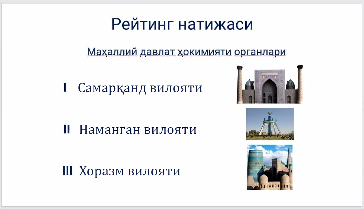 Якуний натижаларга кўра маҳаллий давлат ҳокимияти органлари ўртасида Самарқанд, Наманган ва Хоразм вилояти ҳокимликлари рейтинг жадвалининг энг юқори поғоналаридан жой олди.