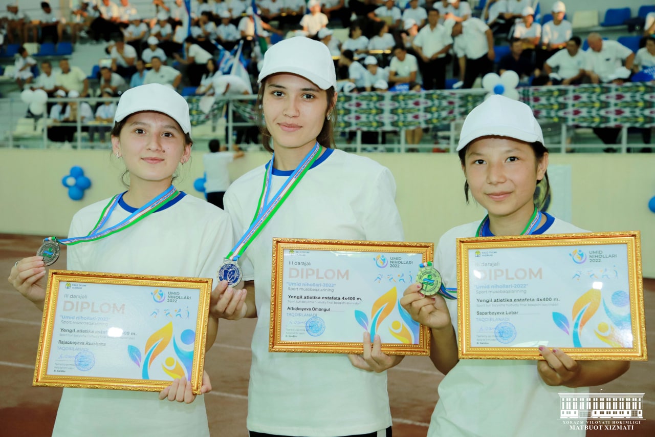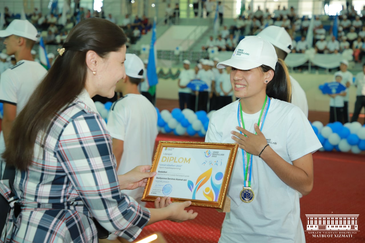 Бугун Урганч шаҳридаги “Ёшлик” спорт мажмуасида “Умид ниҳоллари – 2022” спорт мусобақалари ғолибларини тақдирлаш маросими ўтказилди. Мусобақаларнинг вилоят финал босқичида спортнинг 14 та тури бўйича 2093 нафар ўқувчи ғолиблик учун курашиб, улардан 509 нафари фахрли ўринларни эгалладилар.