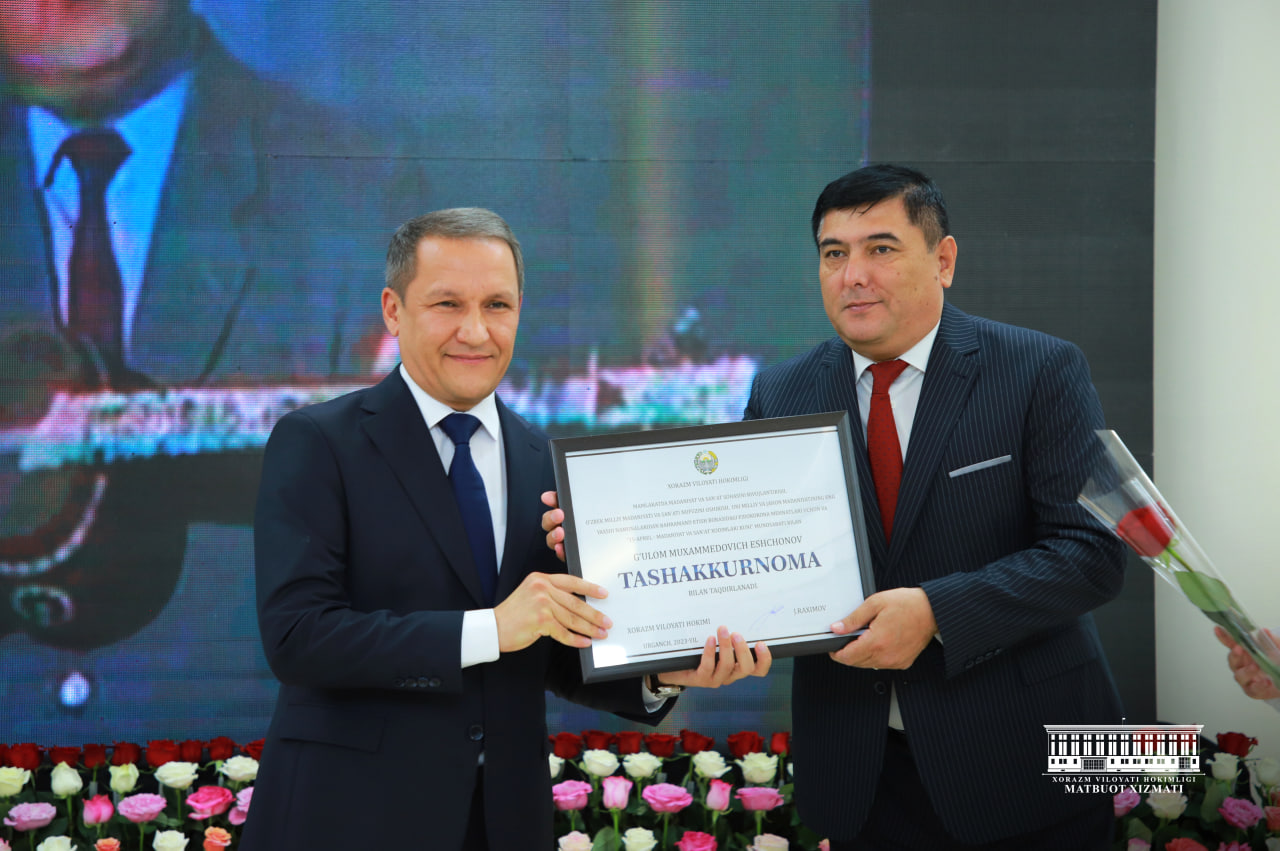 Шу муносабат билан ташкил қилинган тантанали тадбирга соҳада узоқ йиллар сидқидилдан хизмат қилган меҳнат фахрийлари, бугунги кунда самарали фаолият юритиб келаётган фаоллар таклиф этилди. Вилоят ҳокими Жўрабек Рахимов соҳа вакилларини касб байрами билан самимий табриклаб, уларнинг Хоразм маданияти ва санъатини ривожлантириш ҳамда дунёга тарғиб этишдаги фидокорона меҳнатларини эътироф этди. Байрам муносабати билан фаолиятида муносиб ютуқларга эришиб келаётган маданият ва санъат соҳасининг бир гуруҳ ходимлари вилоят ҳокимининг ташаккурномаси ва қимматбаҳо совғалари билан тақдирланди.