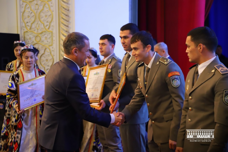 Урганч шаҳрида Ўзбекистон Республикаси Қуролли Кучлари ташкил этилганлигининг 32 йиллиги ҳамда 14 - январь – Ватан ҳимоячилари куни муносабати билан байрам тадбири бўлиб ўтди. Дастлаб ҳарбий-маъмурий сектор, ҳуқуқни муҳофаза қилиш идоралари ва кенг жамоатчилик вакиллари Жалолиддин Мангуберди ҳайкали пойига гулчамбарлар қўйиб, буюк саркарда ва Ватанимиз озодлиги йўлида жон фидо қилган юртдошларимиз хотирасига ҳурмат бажо келтирдилар. Шундан сўнг байрам тадбири вилоят мусиқали драма театрида давом этди. Вилоят ҳокими Жўрабек Рахимов Ватан ҳимоячиларини қутлуғ сана билан самимий муборакбод этди. Вилоят ҳудудида жойлашган ҳарбий қисмларга, шунингдек, хизмат вазифаларини бажаришда юқори касбий маҳорати билан ўрнак бўлиб келаётган бир гуруҳ ҳарбий хизматчиларга вилоят ҳокимининг фахрий ёрлиғи ва совғалари топширилди. Санъат усталари томонидан ижро этилган ҳарбий-ватанпаварлик руҳидаги куй-қўшиқлар, ёш авлодни Ватанга садоқат руҳида тарбиялашга қаратилган саҳна кўринишлари байрам иштирокчиларида катта таассурот қолдирди.