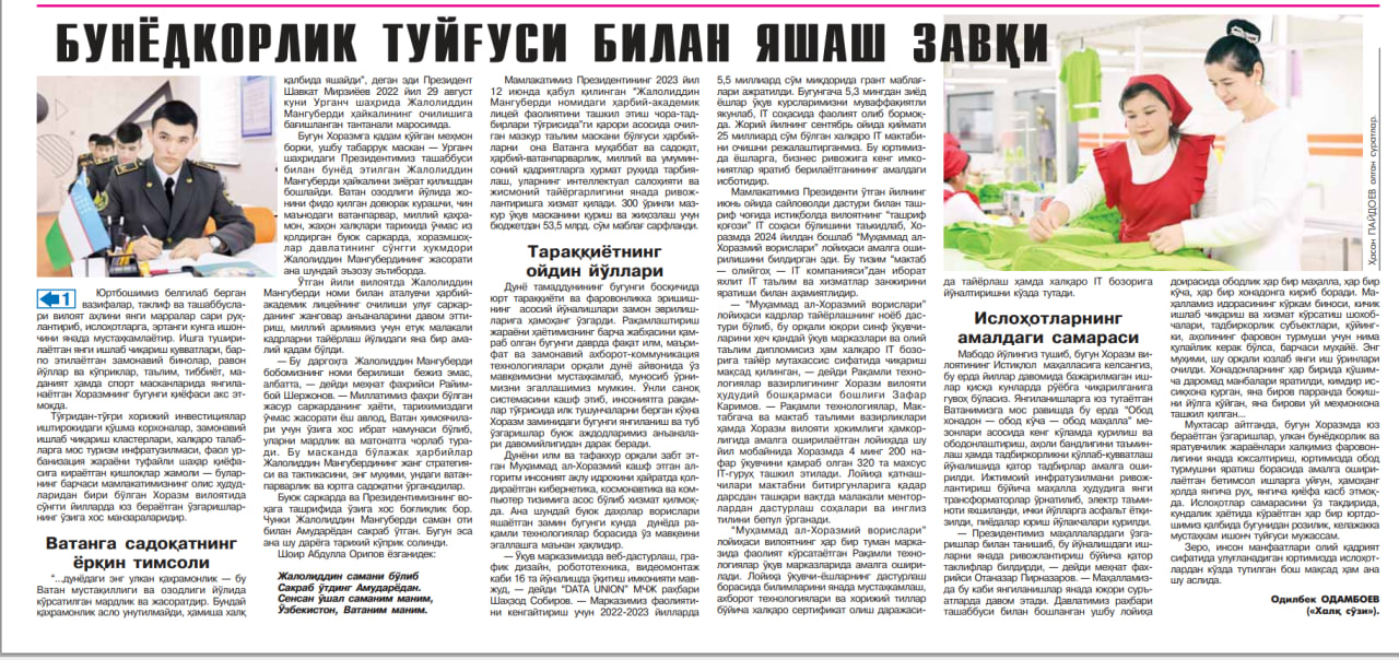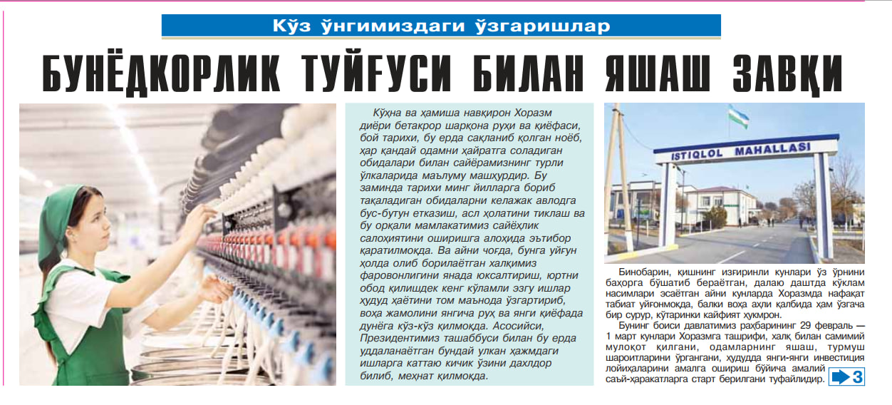 Муҳтарам Президентимизнинг Хоразмга ташрифи доирасида ишга туширилган янги иншоотлар, юртдошларимиз билан қизғин мулоқотлар Республика матбуотида кенг ёритилмоқда.