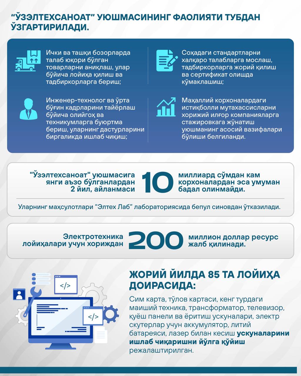 Президент Шавкат Мирзиёев раислигида электротехника соҳасида ишлаб чиқариш, экспорт ва инвестиция оқимини янада кўпайтириш чора-тадбирлари юзасидан ўтган видеоселектор йиғилишида белгиланган асосий вазифалар.