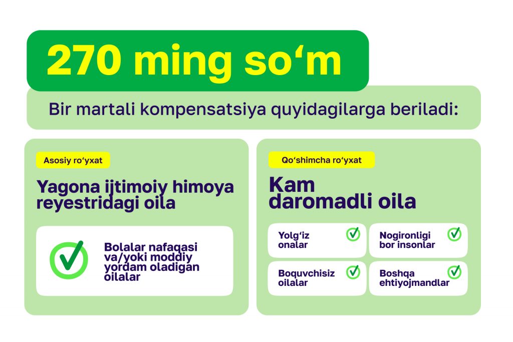 Bir martali kompensatsiyalar 1,4 mln muhtoj oilani qamrab oladi. Davlat ularni to‘lash uchun 370 mlrd so‘m ajratdi. Oktyabr oxirigacha “Inson” ijtimoiy xizmatlar markazi, Mahalla uyushmasi va hokimliklar ehtiyojmandlar ro‘yxatini shakllantiradilar.