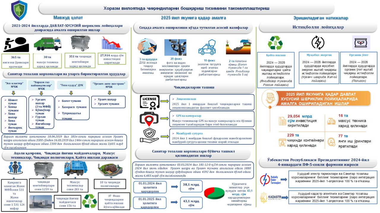 Xorazm viloyatida chiqindilarni boshqarish tizimini takomillashtirish yuzasidan tayorlangan infografika