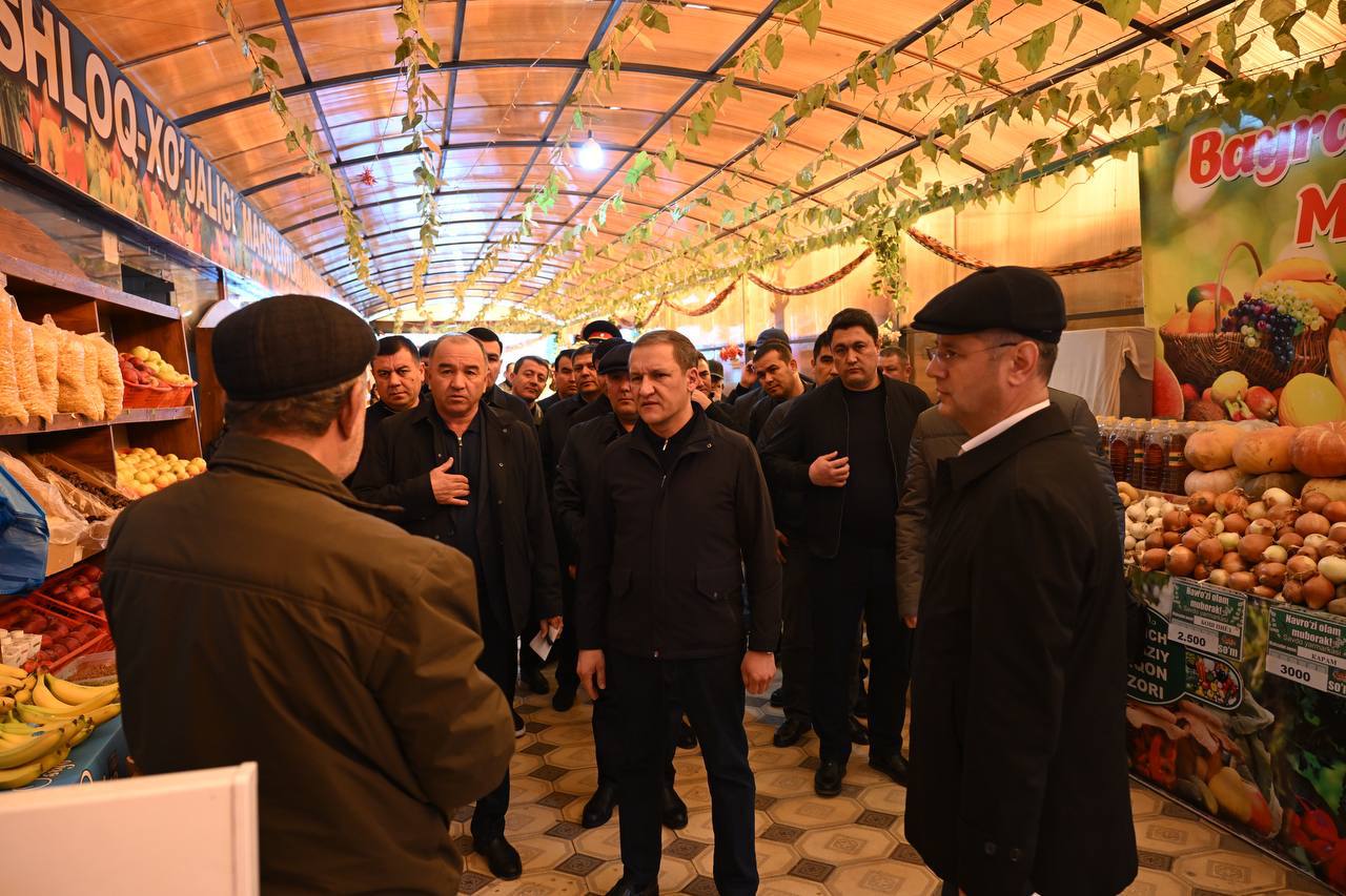 Вилоят ҳокими марказий деҳқон бозорида ҳам бўлиб, асосий турдаги озиқ-овқат маҳсулотлари нарх-навоси билан қизиқди, сотувчи ва харидорлар билан мулоқотда бўлди. Бозорлар тўкинлиги, нархлар барқарорлигини таъминлаш йўлида амалга оширилаётган бундай тадбирлар аҳолининг харид қобилиятини ошириш, халқимизнинг байрам дастурхони янада тўкин бўлишига хизмат қилади.