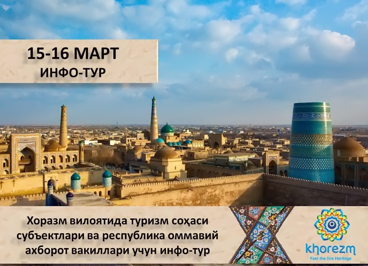 Жорий йилнинг 15-16 март кунлари вилоятнинг туристик салоҳияти, янги туризм йўналишлари ва ҳудуддаги маҳаллий ҳунармандлар томонидан ишлаб чиқарилаётган ҳунармандчилик маҳсулотлари билан республика туризм соҳаси субъектлари ҳамда оммавий ахборот воситалари вакилларини кенг таништириш мақсадида Урганч туманида жойлашган “Улли ҳовли” ва Хива шаҳридаги “Нуруллабой” мажмуалари ҳамда “Ичан Қалъа” давлат музей қўриқхонаси шунингдек, бошқа янги туризм йўналишлари бўйлаб инфо-тур ташкил этиш режалаштирилган.
