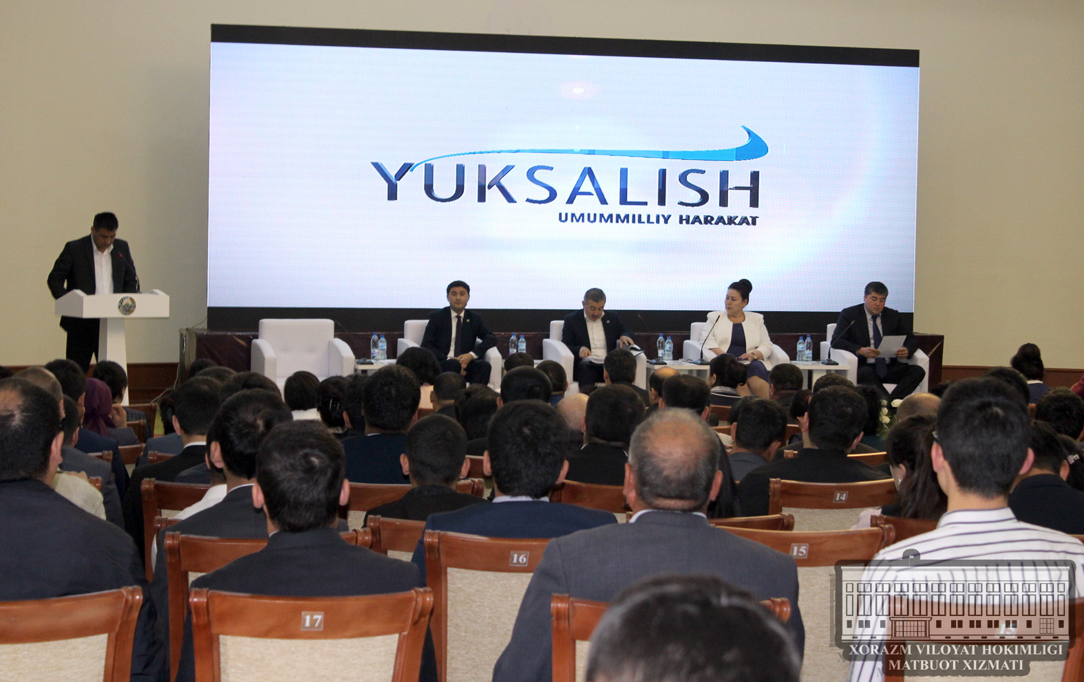 “Юксалиш” умуммиллий ҳаракати томонидан 2019 йилнинг 28-29 апрель кунлари Хоразм вилоятида тарғибот учрашувлари ва жамоатчилик назорати тадбирлари ўтказилди. Мазкур тадбирни ўтказишдан мақсад фуқаролар ҳамда ишбилармон доира вакиллари билан тўғридан-тўғри мулоқотни йўлга қўйиш, уларни ислоҳотлар атрофида бирлаштириш, таклиф ва ташаббусларини ўрганиш шунингдек, ижтимоий-иқтисодий ривожланиш, давлат ва жамият қурилиши соҳаларида юз бераётган ислоҳотлардан хабардор қилиш ҳамда қабул қилинган дастурлар ижроси юзасидан жамоатчилик назорати тадбирларини ўтказишдан иборат.