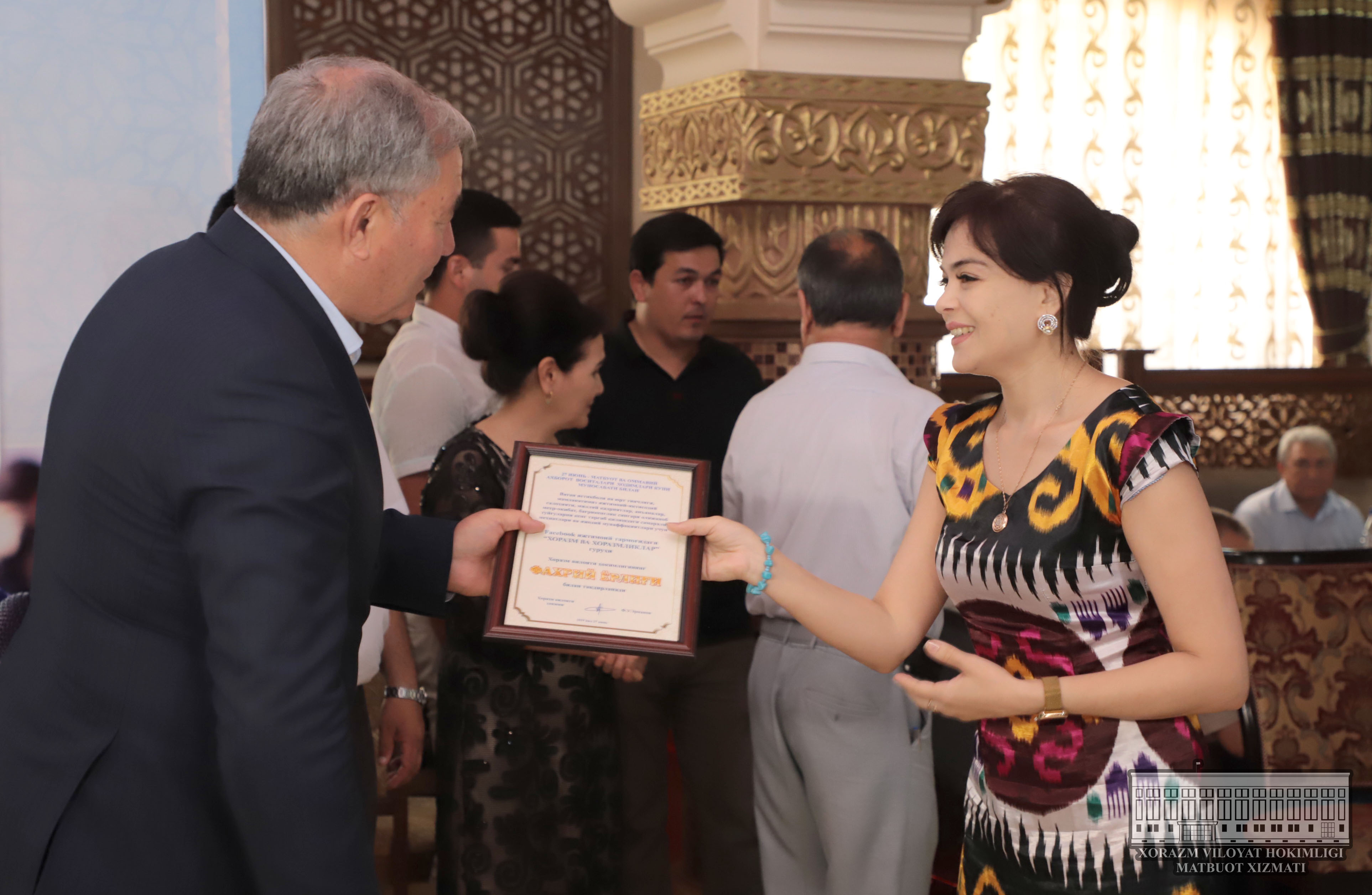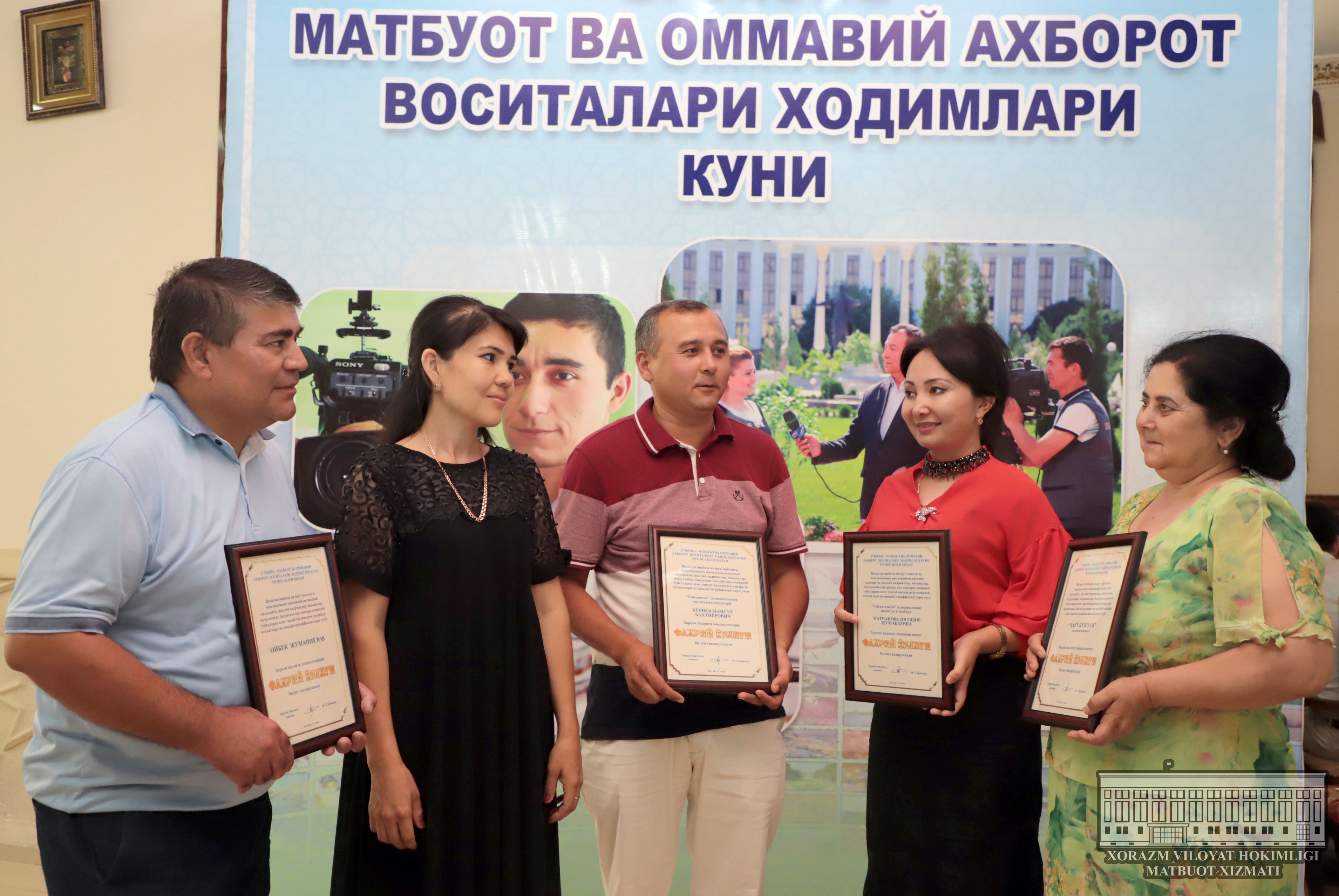 Тадбирда Хоразм вилояти ҳокими Ф. Эрманов соҳа ходимларини қизғин муборакбод қилди. Бугунги кунда вилоятда оммавий ахборот воситалари тизимларини замонавий ахборот технологиялари билан жиҳозлашда салмоқли натижаларга эришилаётгани, вилоятимизда чоп этилаётган 25 та даврий нашр, 1 та давлат ва 2 та хусусий телевидение, битта давлат ва битта FM радиосининг моддий техник базасини мустаҳкамлаш ва замонавийлаштириш чораларини кўриш, Оммавий ахборот воситалари ходимларининг касб малакасини ошириш, ижодий салоҳиятини юксалтириш, уларни жаҳон журналистикасининг бой тажрибалари билан муттасил таништириб, бошқа вилоятлар журналистлари билан ўзаро алоқаларни мустаҳкамлаш, бунинг учун шарт-шароитларни яратиб бериш шу куннинг муҳим вазифаларидан бири эканини ўз сўзида таъкидлади.
