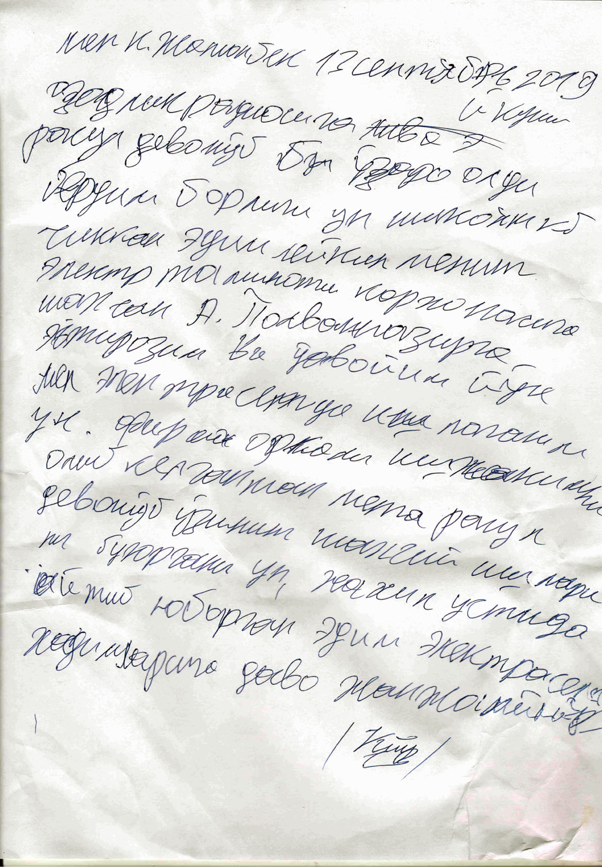 Мен Жамолбек Каримов 13 сентябрь куни Озодлик радиосига Хива шаҳар электр таъминоти корхонаси бошлиғи Расул Девонов билан ўзаро олди-бердим борлиги учун шикоят қилиб чиққан эдим. Лекин менинг Хоразм ҳудудий электр тармоқлари корхонаси ва шахсан Хива тумани электр таъминоти корхонаси Полвонназир Абдуллаевга эътироз ва даъвоим йўқ. Мен Электр таминоти корхонаси биносини тамирлаш ишларини олиб борганим сабабли фирма орқали иш хақимни олиб келганман. Менга Расул Девонов ўзининг шахсий ишларини буюргани учун жахл устида Озодлик мухбирларига жахл устида ахборот берган эдим. Электр таминоти корхонаси ва унинг ходимларига эса хеч қандай даъво ёки жанжалим йўқ дея Жамолбек Каримов хеч қандай босимларсиз ўз қўли билан ёзган билдиришномани олиб келди. Қуйида хатнинг асл нусхаси илова қилинади.