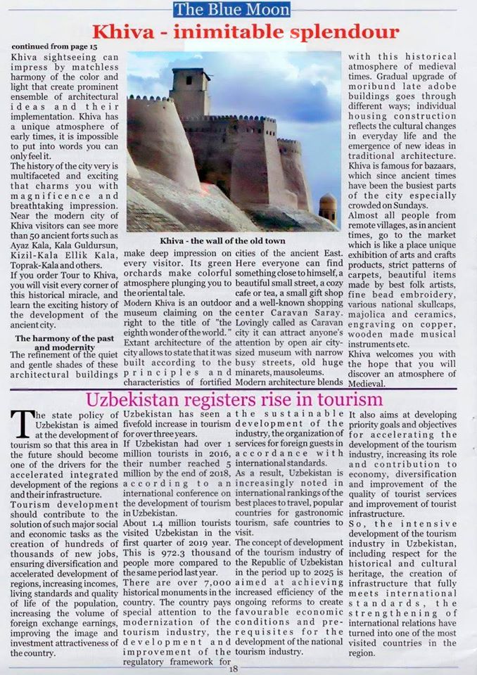 Бундан ташқари “Хива - мисли кўрилмаган улуғворлик” ҳамда “Ўзбекистонда туризмнинг ўсиши қайд этилмоқда” мавзуларида ҳам мақолалар чоп қилинган. Биламизки "The Blue Moon" журнали Хиндистондаги энг оммабоп журналлардан бири ҳисобланади.