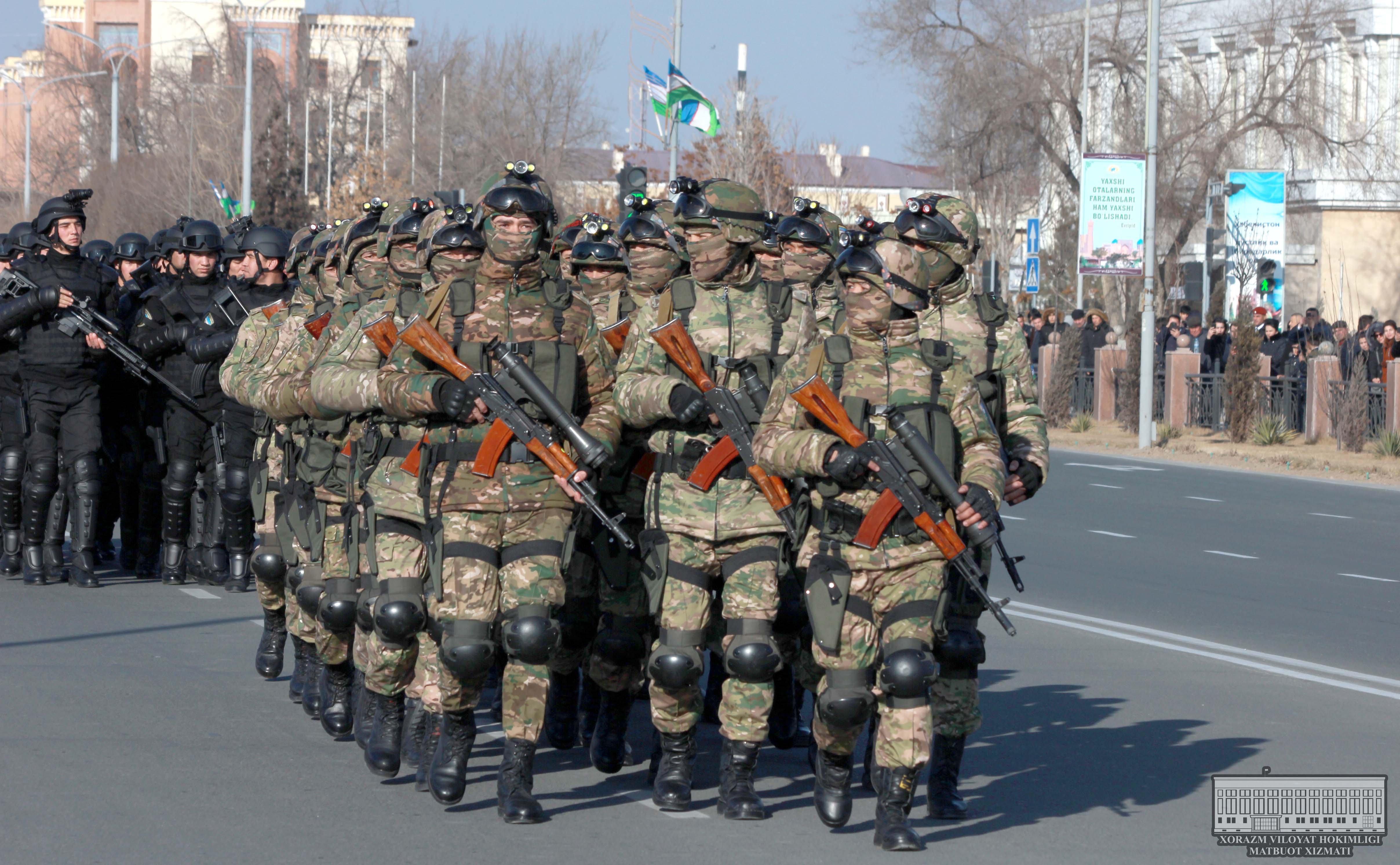 Шундан сўнг ҳарбий техника юриши ва турли ҳарбий қисмлар хизматчилари қўшиқ куйлаган ҳолда Ал-Хоразмий кўчаси бўйлаб саф тортиб ўтишди.