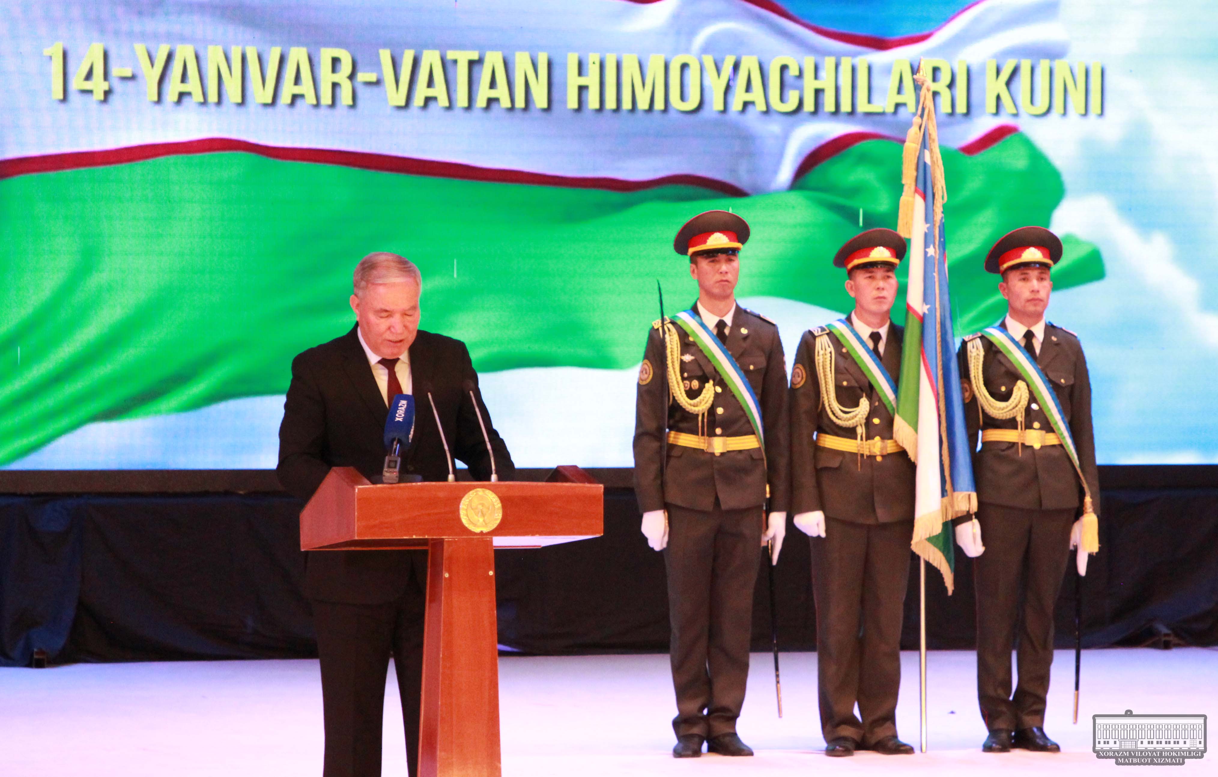 Огахий номидаги вилоят мусиқали драма театрида давом этган тантанали маросим байрамга ўзгача шукух бағишлади. Вилоят ҳокими Фарход Эрманов Ўзбекистон Республикаси Президенти, Қуролли Кучлар Олий Бош Қўмондони Шавкат Мирзиёевнинг Қуролли Кучларимиз ташкил этилганининг 28 йиллиги ва Ватан ҳимоячилари куни муносабати билан байрам табригини ўқиб эшиттирди.