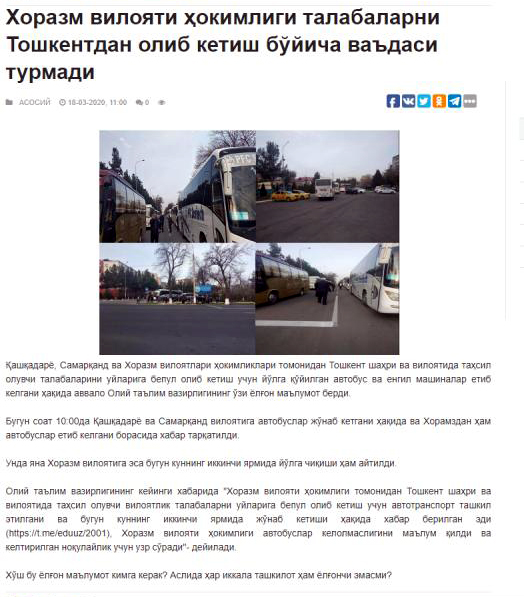 Ижтимоий тармоқларда Хоразм вилояти ҳокимлиги талабаларни Тошкентдан олиб кетиш бўйича ваъдасида турмагани айтилаётган маълумотлар катта кўпчиликнинг эътиборини тортди. Aслида хам шундайми?