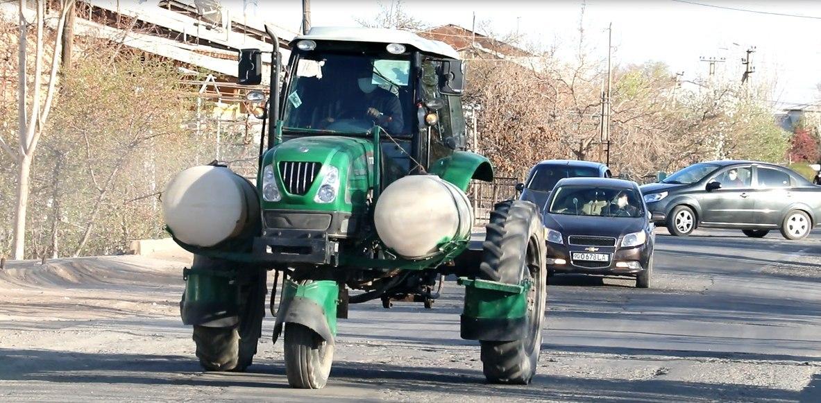 Урганч туманида кенг миқёсли дезинфексия ўтказилмоқда, туманнинг марказий кўчалари ва қишлоқ йўллари трактор ёрдамида махсус ечим билан ишлов берилади.