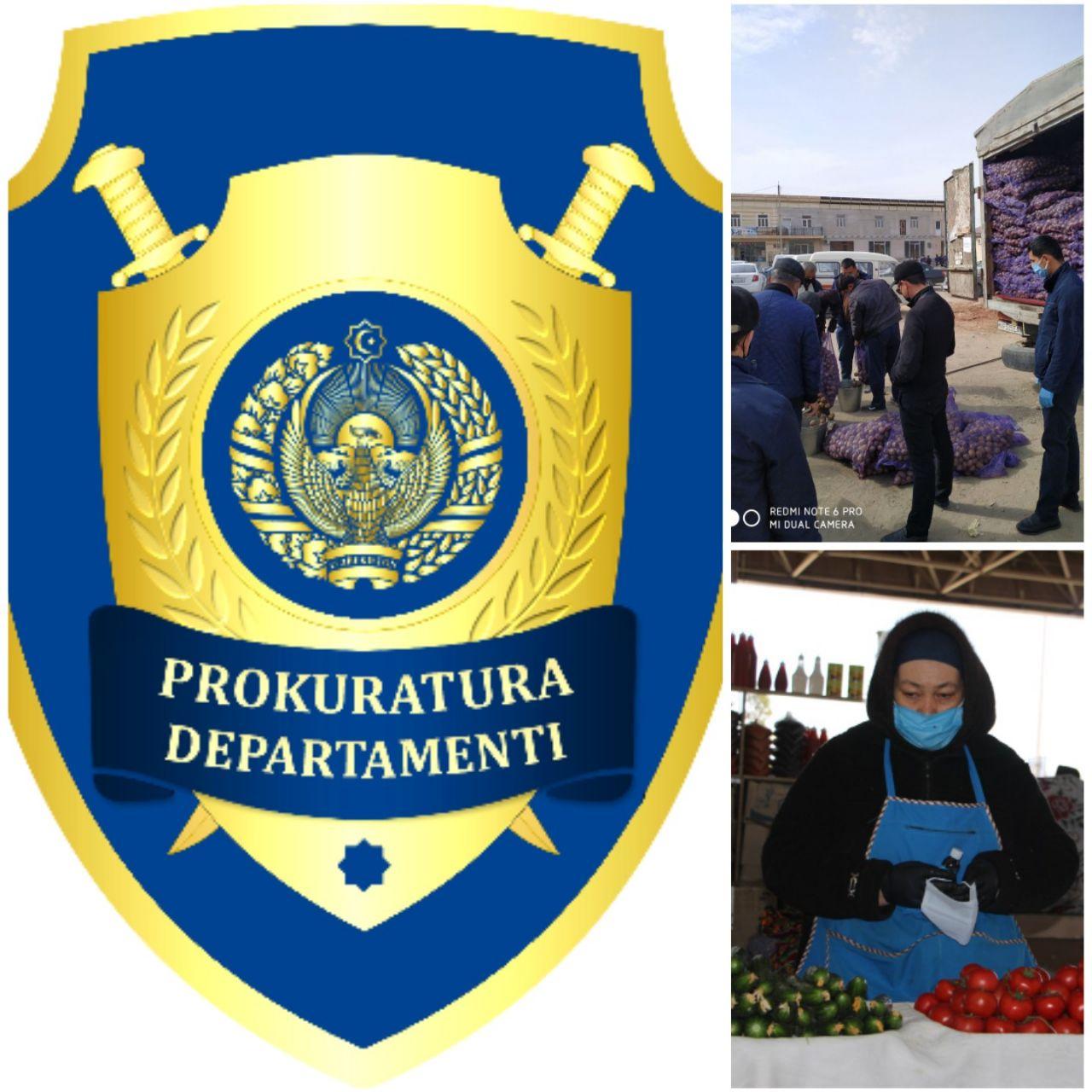 Мамлакатимизда коронавирус пандемияси сабаб карантин эълон қилинди. Ушбу жараёнда деҳқон бозорларида, савдо марказларида озиқ-овқат ва қишлоқ хўжалиги маҳсулотларининг узлуксизлигини таъминлаш, нарх-навони сунъий ошиб кетишини олдини олиш, захира омборларида сақланаётган қишлоқ хўжалиги маҳсулотларининг арзонлаштирилган нархларда деҳқон бозорларига етказиб бериш ишлари жадаллик билан давом этмоқда. Бу жараёнда Ўзбекистон Республикаси Бош прокуратураси ҳузуридаги Департаментининг Хоразм вилоят бошқармаси ва унинг ҳудудий бўлимлари томонидан вилоятдаги барча деҳқон бозорлари, савдо дўконлари қишлоқ хўжалиги махсулотлари билан таъминланмоқда.