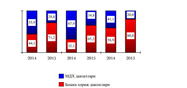 2015 yil yanvar-iyun oylarida MDH va boshqa xorij davlatlari bilan amalga oshirilgan tashqi savdo tarkibi quyidagicha ifodalanadi: