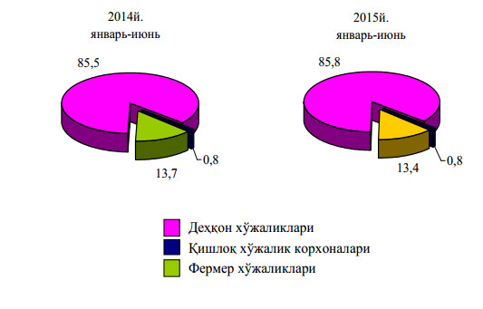 2015-yil 2-kvartal statistik va tahliliy axborotlar (875 kb) 2015 yilning yanvar-iyun oylarida qishloq xo‘jaligi mahsulotlari ishlab chiqarish amaldagi narxlarda 1076621,6 mln. so‘mni va 2014 yilning shu davriga nisbatan 106,2 foizni tashkil qildi. Qishloq xo‘jaligi mahsulotlari ishlab chiqarishning umumiy hajmida dehqonchilik mahsulotlari ishlab chikarish hajmi 322702,9 mln. so‘mni (2014 yil yanvar-iyuniga nisbatan 104,9 foiz), chorvachilik mahsulotlari - 753918,7 mln. so‘mni (106,8 foiz) tashkil etdi. Qishloq xo‘jaligi mahsulotlari ishlab chiqarishning umumiy hajmida dehqonchilik mahsulotlarining ulushi 30,0 foizni, chorvachilik mahsulotlari 70,0 foizni tashkil qildi.Qishloq xo‘jaligi mahsulotlari ishlab chiqarish hajmining xo‘jaliklar toifalari bo‘yicha taqsimlanishi quyidagicha ifodalanadi: