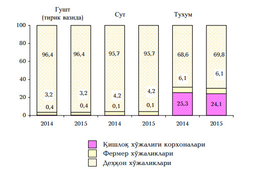2015 yilning yanvar-iyun oylarida qishloq xo‘jaligi mahsulotlari ishlab chiqarish amaldagi narxlarda 1076621,6 mln. so‘mni va 2014 yilning shu davriga nisbatan 106,2 foizni tashkil qildi. Qishloq xo‘jaligi mahsulotlari ishlab chiqarishning umumiy hajmida dehqonchilik mahsulotlari ishlab chikarish hajmi 322702,9 mln. so‘mni (2014 yil yanvar-iyuniga nisbatan 104,9 foiz), chorvachilik mahsulotlari - 753918,7 mln. so‘mni (106,8 foiz) tashkil etdi. Qishloq xo‘jaligi mahsulotlari ishlab chiqarishning umumiy hajmida dehqonchilik mahsulotlarining ulushi 30,0 foizni, chorvachilik mahsulotlari 70,0 foizni tashkil qildi.Qishloq xo‘jaligi mahsulotlari ishlab chiqarish hajmining xo‘jaliklar toifalari bo‘yicha taqsimlanishi quyidagicha ifodalanadi: