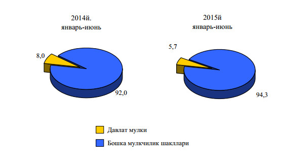 Nodavlat mulkchilik shaklidagi tashkilotlar tomonidan 506991,0 mln. so‘mlik qurilish ishlari amalga oshirilib, qurilish ishlarining umumiy hajmida 94,3 foizni (2014 yilning yanvar-iyuniga nisbatan 103,8 foiz) tashkil qildi.