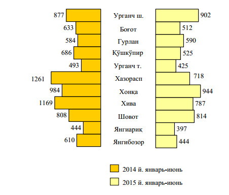 2014 yilning shu davriga nisbatan o‘lganlar soni 221 kishiga yoki 0,9 foizga kamaydi. O‘lganlar sonining kamayishi Bog‘ot tumanida (4,3dan 3,8 promillega), Xazorasp tumanida (4,3 dan 4,1 promillega), Xiva tumanida (4,4 dan 3,6 promillega), Shovot tumanida (4,1 dan 3,3 promillega) kamayish kuzatildi.