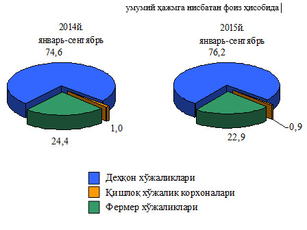 2015 yilning yanvar-sentyabr oylarida qishloq xo‘jaligi mahsulotlari ishlab chiqarish amaldagi narxlarda 1943167,6 mln. so‘mni va 2014 yilning shu davriga nisbatan 106,4 foizni tashkil qildi. Qishloq xo‘jaligi mahsulotlari ishlab chiqarishning umumiy hajmida dehqonchilik mahsulotlari ishlab chikarish hajmi 776199,6 mln. so‘mni (2014 yil yanvar-sentyabriga nisbatan 103,9 foiz), chorvachilik mahsulotlari 1166968,0 mln. so‘mni (108,2 foiz) tashkil etdi. Qishloq xo‘jaligi mahsulotlari ishlab chiqarishning umumiy hajmida dehqonchilik mahsulotlarining ulushi 39,9 foizni, chorvachilik mahsulotlari 60,1 foizni tashkil qildi.