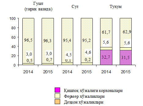 2015 yilning yanvar-sentyabr oylarida barcha toifadagi xo‘jaliklarda 104,5 ming tonna tirik vaznda go‘sht (o‘tgan yilga nisbatan 108,1 foiz), 717,8 ming tonna sut (108,4 foiz), 290,8 mln. dona tuxum (107,6 foiz), 1076 tonna jun (105,0 foiz), 5,7 ming dona qorako‘l teri (105,1 foiz) etishtirildi.