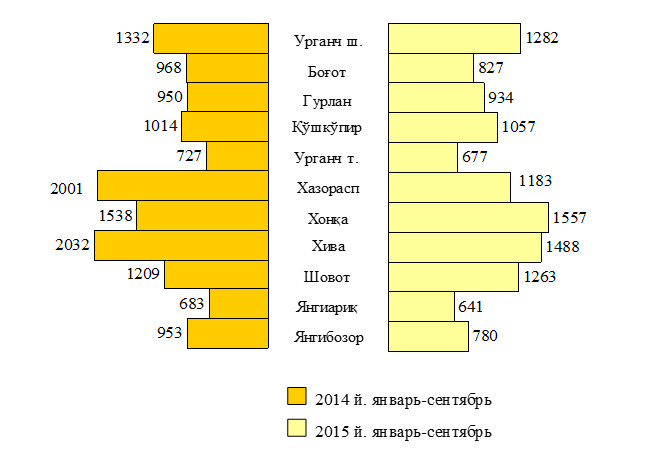 2014 yilning shu davriga nisbatan o‘lganlar soni 18 kishiga yoki 0,9 foizga kamaydi. O‘lganlar sonining kamayishi Bog‘ot tumanida (4,2 dan 3,9 promillega), Gurlan tumanida (4,5 dan 4,0 promillega), Xiva tumanida (4,3 dan 4,0 promillega), Shovot tumanida (4,1 dan 3,7 promillega) kamayish kuzatildi.
