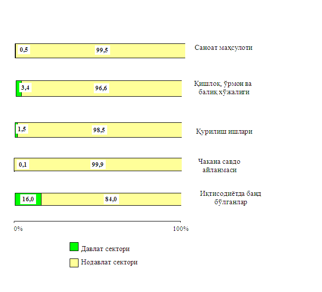 2016 yil yanvar-iyunda iqtisodiy faoliyat turlari bo‘yicha mahsulot ishlab chiqarishda hamda aholi bandligi bo‘yicha davlat va nodavlat sektorlarining nisbati quyidagicha ifodalanadi: