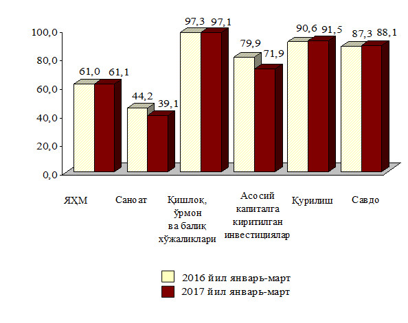 2017 йил январь-мартида иқтисодий фаолият турлари бўйича саноат маҳсулотини ишлаб чиқариш қуйидагича ифодаланади: