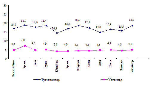 Туғилиш даражасининг камайиши вилоятнинг Гурлан туманида (20,1 дан