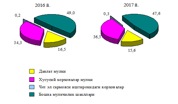 Рўйхатга олинган корхоналар умумий сонининг 84,4 фоизи нодавлат мулки шаклидаги корхоналар, шундан 36,5 фоизи хусусий корхоналар, 0,3 фоизи чет эл сармояси иштирокидаги корхоналар, 0,2 фоизи акциядорлик жамиятлари, 47,4 фоизи бошқа корхоналар улушига тўғри келди.