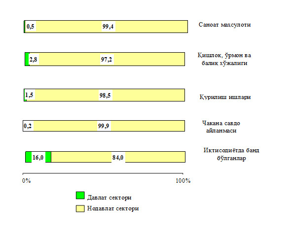 2017 йил январь-мартда иқтисодий фаолият турлари бўйича маҳсулот ишлаб чиқаришда ҳамда аҳоли бандлиги бўйича давлат ва нодавлат секторларининг нисбати қуйидагича ифодаланади: