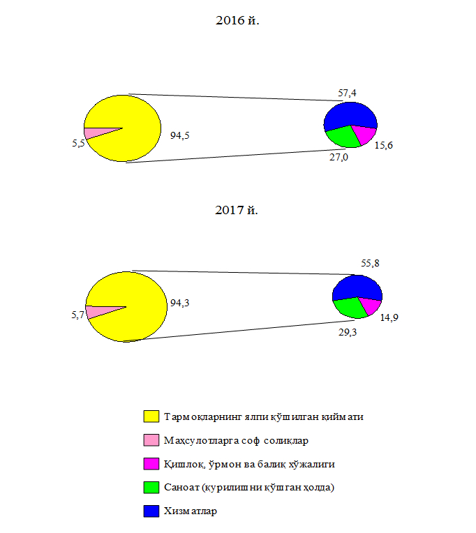 | Тармоқларнинг ялпи қўшилган қиймати | 2 624,3 | 3 179,9 | 111,0 |