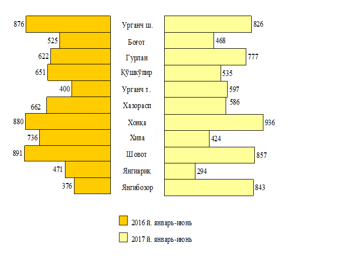 2017 йилнинг январь-июнида бандликка кўмаклашувчи марказларига ишга жойлаштиришда ёрдам беришни сўраб, 8417 нафар фуқаро мурожаат қилди. Иш қидириб Урганч шаҳарда 962 та, Боғот туманида 509 та, Гурлан туманида 889 та, Қўшкўпир туманида 625 та, Урганч туманида 679 та, Хазорасп туманида 682 та, Хонқа туманида 1066 та, Хива туманида 498 та, Шовот туманида 1197 та, Янгиариқ туманида 418 та, Янгибозор туманида 892 та фуқоро мурожаат этган.