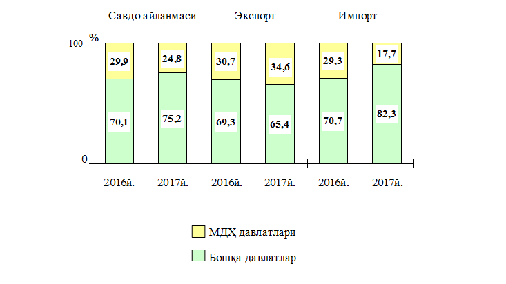 2017 йил январь-июнда МДҲ ва бошқа хориж давлатлари билан амалга оширилган ташқи савдо таркиби қуйидагича ифодаланади: