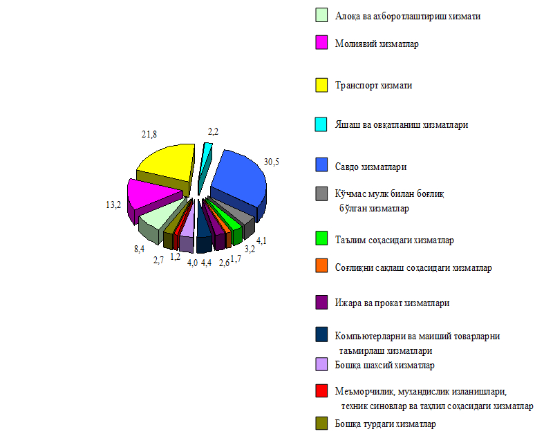 Хизмат кўрсатишда энг катта улуш молиявий (13,1 фоиз), транспорт (21,8 фоиз), ва савдо (30,5 фоиз) хизматларига тўғри келди.