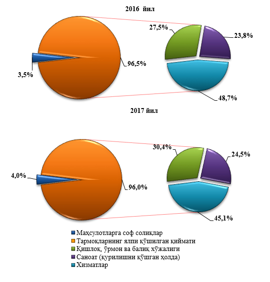 | Тармоқларнинг ялпи қўшилган қиймати | 6554,9 | 7900,7 | 104,5 |