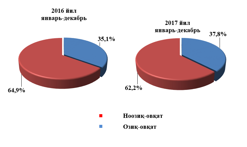 Ҳисобот даврида 2291,7 млрд. сўмлик халқ истеъмол товарлари ишлаб чиқарилиб, 2016 йил январь-декабрь ойларига нисбатан 108,6 фоизни ташкил этди.