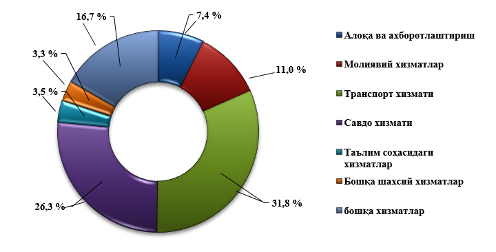 Хизматлар таркибида энг катта улуш савдо хизматлари (жами хизматларнинг 26,3 фоизи), транспорт хизматлари (31,8 фоизи), молиявий хизматлар (11,0 фоизи), алоқа ва ахборотлаштириш хизматлари (8,7 фоизи) ҳиссасига тўғри келди.